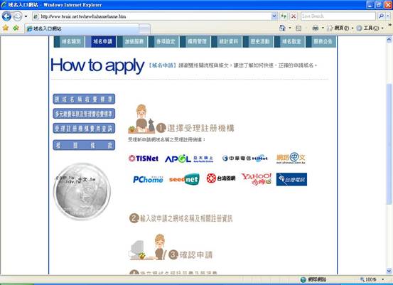 在台灣,您可由以下的 “台灣網路資訊中心”, 其網址為 http://www.twnic.net/ 的網頁中, 找到各家 “域名” 即(網域名稱) 註冊提供商。