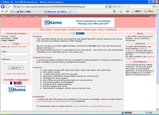 此服務商在於提供:處理回應DNS記錄、詢答您的網域名稱 (請參閱本書附錄二的第2步驟,其中介紹如何取得)和相關的固定IP位址(請參閱本書附錄二中的第1步驟,其中介紹如何取得)。如此,網際網路上的每個人都可以使用您的網域名稱來搜尋到您的伺服器。在國外有不少的“DNS主機代管業者”,例如http://www.xname.org 即是其中之一,其所提供的 “處理回應DNS記錄、詢答您的網域名稱的服務” 是免費的,您可以瀏覽該網站後登錄,以取得免費的空間及帳號,通常,DNS主機代管業者會提供一個網頁介面,讓您輸入您的 “網域名稱”和 “變換的IP位址記錄” 到該伺服器中。在資料輸入之後,本步驟即完成。