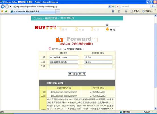 網域名稱註冊供應商”所提供的網頁會向您詢問 “DNS主機” 的IP位址。通常,您需要找到DNS主機代管業者提供的或是您自行架構的DNS伺服器的兩個DNS伺服器的兩個IP位址。〈一個被稱為“首要DNS主機伺服器”,另一個則是“備用DNS主機伺服器”。)這兩個IP位址,需輸入到“網域名稱註冊供應商”伺服器網頁上所提供的的欄位中。