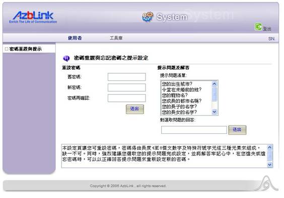 提示問題及解答 是讓您選取您的提示問題並完成回答的設定,以防在您遺忘密碼時,找不到方法可以立即進入系統。您可以以正確的回答提示問題來重新設定新的密碼。提示問題及解答的這個項目,關係到您在忘記密碼時,是否可以在登入的畫面按下“忘記密碼?”之後,藉由回答簡單的問題,來達成用迅速簡便的方式變更成新密碼,以解燃眉之急。因此,強烈建議您,最好能在拿到帳號密碼後,就即刻來此設定提示問題,答案最好是能容易記憶,印象深刻。當您下次忘記密碼的時候,就能直接變更密碼以順利登入系統使用,而略過向系統管理員查詢申請的困擾了。