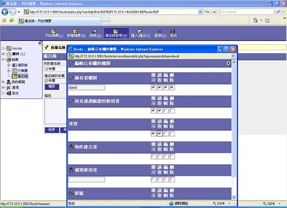 行事曆協助您記憶日常所有大大小小的瑣事,亦可設定提醒時間,系統將寄發電子郵件提醒您重要的事件。備忘錄則可幫忙備忘各種事項,而且還可以利用權限 的規劃,設定出佈告欄的功能,讓您溝通訊息更加暢通便捷。