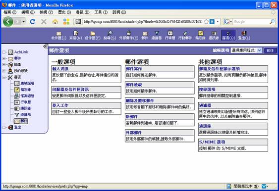登入之後您可以看到左上方的框架裡有一些功能選項。“郵件”當然是收發信件的地方;而“組織”裡的通訊錄、行事曆、備忘錄則是此信箱所提供的好幫手;“我的帳號”與“選項”裡,有公共空間可供上傳分享,和黑白名單的過濾設定以及一些個人化的畫面與規則設定等。