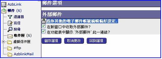 欲收取外部郵件,可由左列【選項】之【郵件】中,選擇【外部郵件】
