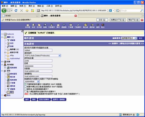 之後會出現一個其他選項,其中有外部郵件識別名稱會以下拉式選單讓使用者選擇帳號,或是按下直接建立一個新的帳號的按鈕。第一次使用者,應該都不會有內建帳號可供選擇,所以,要收取外部郵件,首先必須先建立外部郵件的新帳號。按下建立一個新的帳號的按鈕後,在出現的下拉式選單中選擇“IMAP/POP3郵件伺服器”的伺服器型態,將顯示在畫面上的表單欄位一一填上相對應的數值,如此,按下儲存後,便可開始收取外部郵件了。