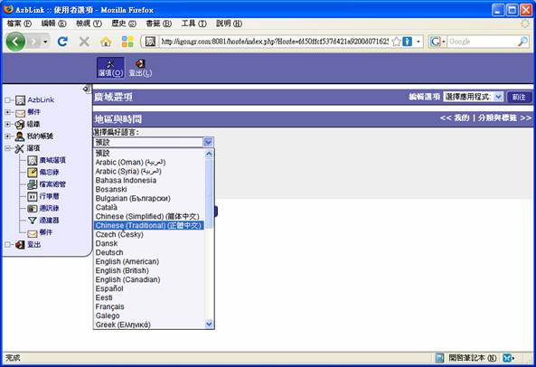 不過,附加檔案是無法被收取或是送出的,這取決於您持有之手機的功能限制。另外,由於系統預設語言是以英文介面為主,倘若您的手機支援中文介面,而您亦偏好使用中文,那麼,您可至網頁電子郵件信箱裡的 選項 >> 廣域選項 >> 地區與時間 去調整偏好語言,將之設定為正體中文,儲存選項即可。