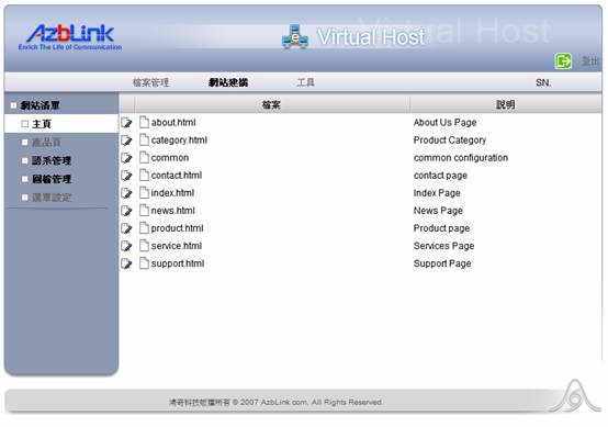 主頁 是除了詳細產品資訊外的主要網頁,網站(web)所有的瀏覽頁面內容幾乎都在主頁做編輯,依樣版的差異會呈現出不同的主題內容,不過基本的主頁內容大致都是相近的。像是最基本的如 about.html是編輯關於我們、關於公司企業的介紹頁面; common是通用內容編輯,幾乎會出現在每一個網頁裡的網站組成要素,如logo、banner…; contact.html是聯絡我們的表單頁面,一般來說,預設的內容就已經完整,除非有特殊需求(如新增語系之屬),否則是不太需要做去做任何維護的; index.html就是首頁的內容編輯; news.html是公佈消息的編輯處,不論是公司的最新消息、要給消費者了解的產品新知,或是其他消息的公告皆可在此編輯; support.html是支援,技術文件支援、產品支援或是提供工具讓使用者下載之載點連結編輯皆在此。