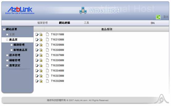 產品頁 是放置產品資訊,介紹產品的網站網頁。按下details.html的編輯圖示 ,在產品頁的下方將會出現新增產品頁,以及若有產品存在亦會展開產品編號列表,欲維護現有產品只需在該產品編號中再按下編輯圖示 即可。