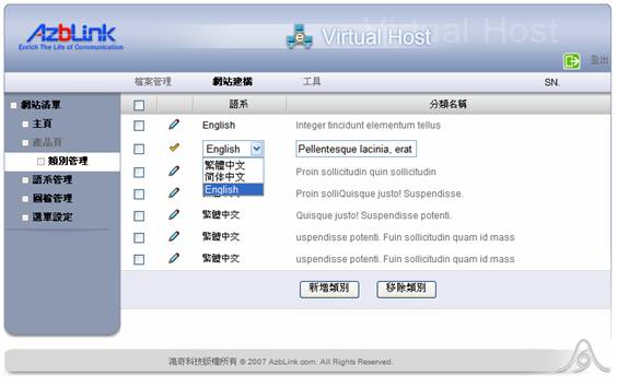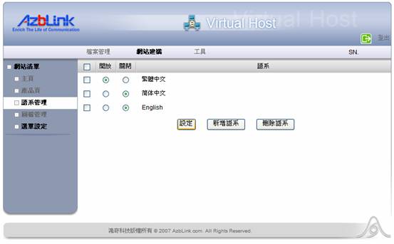 語系管理 可讓網站管理者去決定網站所要展現的語言介面有哪些。預設語系為繁體中文、簡體中文和英文三種,網站管理者可依維護的需要或現實的考量,將某些語系暫時關閉或是刪除。系統共提供了多達20幾種語言可供選擇建置。