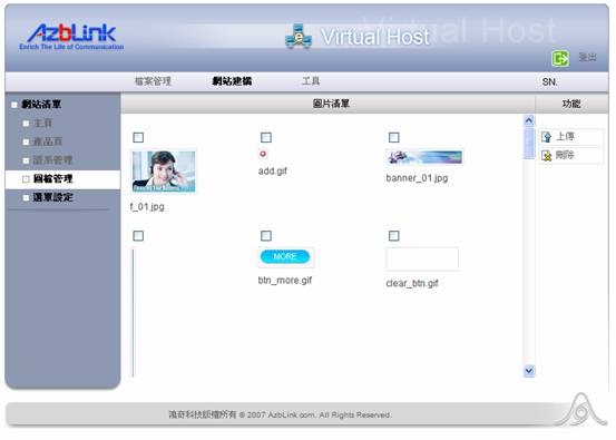 圖檔管理 是管理網站所有圖片的介面,可依網站需求上傳圖檔或刪除。