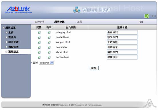 網頁清單可分為主頁、產品頁、語系管理和圖檔管理以及選單設定等五大項主要功能。