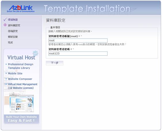 *圖四為資料庫設定,由於要將資料庫表格匯入資料庫,所以必須填資料庫帳號及密碼,以利建立樣版的相關資料,而一般資料庫帳號密碼即為root及root密碼。填完密碼後請繼續按下一步。