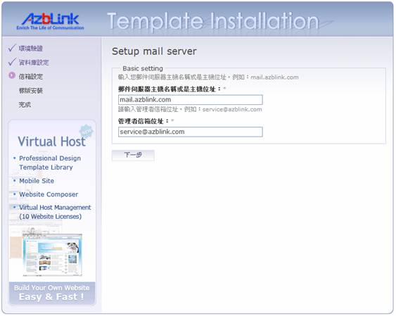 *圖五是信箱設定,因為樣版設計裡有需要使用到寄信的功能,如”聯絡我們”會需要將相關表格回傳,所以必須指定一個合法的郵件主機,以及一個如客服信箱之類的收件信箱位址。