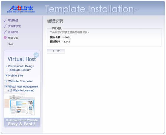 若已擁有樣版,可在選定一個欲建構的網站後,再點選安裝的功能,安裝程式自會以出現提示文字或提示對話頁面的方式,導引使用者循序漸進的將網站樣版安裝完成。