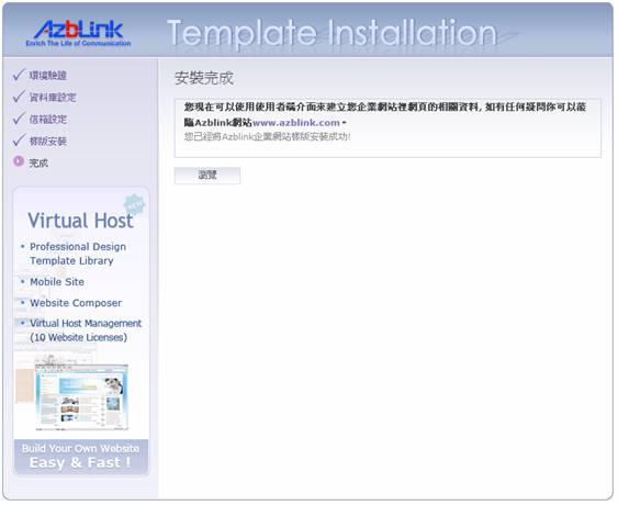 *圖七完成則是樣版已安裝成功,只要按下瀏覽按鈕,便可立即瀏覽已安裝完成的樣版畫面。