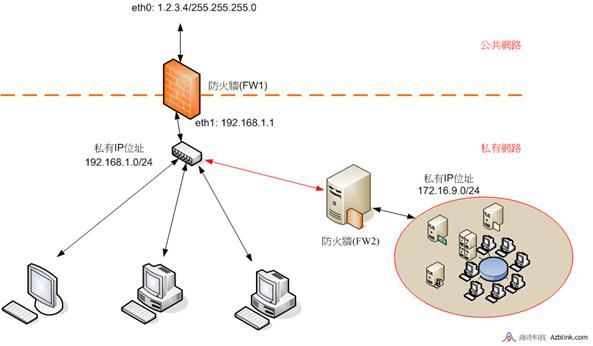 FW2是另一個具有NAT功能的邊界控制路由;它的一邊是辦公室網路,另一邊是實驗室網路。FW2“面向”辦公室網路,網路192.168.1.0中的任何一台PC都不能察覺到網路172.16.1.0/24。實驗室中機器之間的傳輸將不會穿過FW2,它們都只是待在其子網路中。但當實驗室中的人們想要從位於192.168.1.0/24的機器上獲取某些資料時,他們仍然可以從實驗室中去存取那些在192.168.1.0/24的機器。