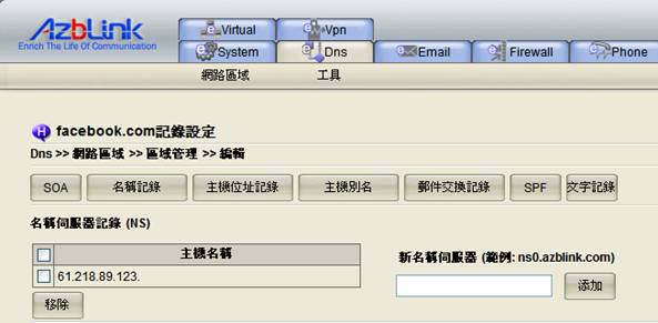 然後A紀錄裡所有主機名稱的位址也都寫入自己網站的IP,這樣一來,區網裡的使用者便都會被誘騙到自家DNS裡的facebook紀錄的位址,而無法連結到真正的facebook網站了,但前提是,要記得在邊界控制路由設立封鎖(DROP)所有Loc to Net UDP 53的規則,以防止其他DNS介入而破功;或者利用邊界控制路由來管制IP或網址抑或頻寬,讓使用者根本沒辦法去連線,或是因為網頁瀏覽速度過慢而直接放棄連線,這些都是不錯的應用方式,當然也可使用邊界控制路由規則加上Proxy搭配網址掃描去過濾特定網站,如在 Border Control >> 規則 >> 新增規則 裡加入規則
