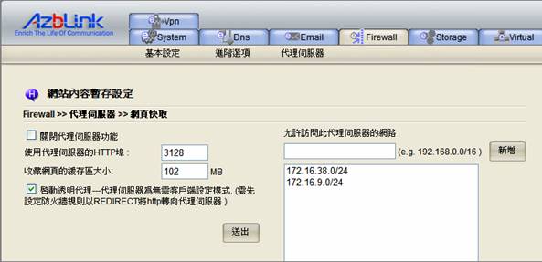 然後在 Border Control >> 代理伺服器 >> 網頁快取 頁面中啟動透明代理,與允許訪問的網路區段加入,接下來再至 Border Control >> 代理伺服器 >> URL掃描 將欲封鎖的網址(facebook.com)加入即可。