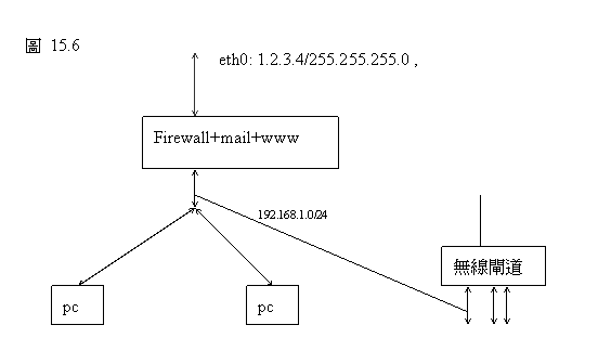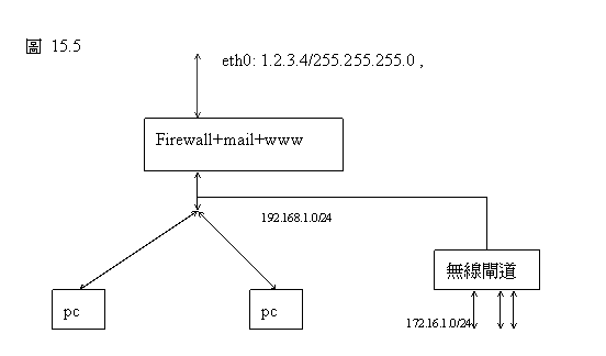 如果您將它的WAN介面連接到一個內部網路中,您必須注意,在無線閘道的LAN介面的IP位址空間上,不能設定與該內部網路相同的IP區段。如下圖例: