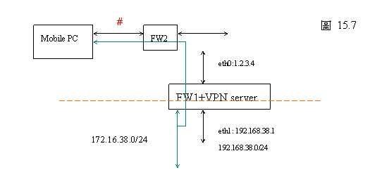 回想之前的VPN章節,我們曾提及位址衝突的問題。所以,請盡量選擇在其他地方很少會被使用到的私有IP位址空間。在下圖中,FW1 是您辦公室的邊界控制路由,您攜帶行動PC到了其他人的辦公室其邊界控制路由是FW2。您使用VPN用戶端程式連回您辦公室的網路。自然,邊界控制路由FW2必須允許外發的連接。否則,您連使用VPN的機會都沒有。