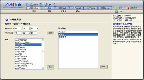 此頁面上顯示了三個主要專案:時區,語言設定,本地時間設定。在時區選項中,有很多不同的方式允許您指定伺服器使用的時區,如地區/國家,或與格林威治標準時間的時差等。請注意,系統設定首要之初就是校正時間,在您更改時間時,您必須輸入24小時制的時間到設定項目中。