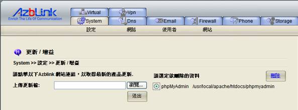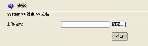 某些Azblink提供的套裝軟體可在此安裝。當您要安裝全新的套裝軟體至系統時使用的,假設您已下載或在您單機的硬碟上已有此套裝軟體,請用瀏覽按鈕去找到它並將之送出上傳。