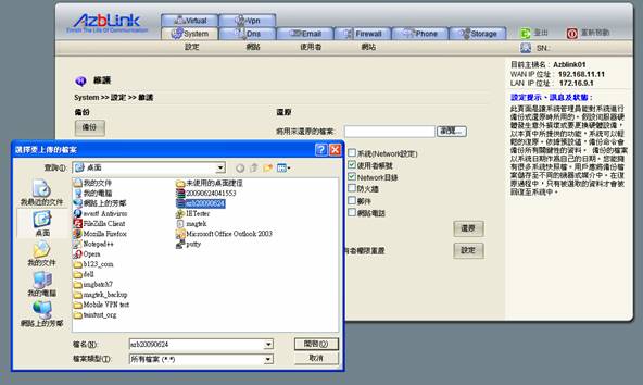 那些系統設定檔案會被依照日期壓縮並儲存。檔案包括網路設定、邊界控制路由規則,用戶帳號和密碼。如果您因為在系統輸入錯誤資料而導致出錯時,存取Web介面,您將有機會還原原先的設定。