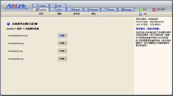 此頁面可檢視系統所產生的紀錄,這些記錄(日誌)檔記錄了系統運作情形及發生的事件,主要是要讓MIS用來作為系統除錯的參考。為了保護系統,檔案中只呈現紀錄檔中最後的1000行資訊。若需要更詳細的資訊,得使用控制檯模式,執行相關指令來讀取檔案中更多的資訊。