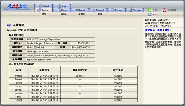 一旦獲取了使用授權檔案,所有被授權的功能都會啟用。啟動代碼由40個阿拉伯數字組成,它被分割為四組,每組10個號碼。當您想試用軟體要去取得使用授權時,您應準備好啟動代碼。在畫面中,“取得服務商ID字號”是用來鑒別為您安裝此軟體已註冊的支援團隊,在此狀況下,Azblink可以用此資料,作日後服務之準備,若您決定將Azblink的伺服器軟體實際應用商業運作,在此強烈建議您務必尋求一個可靠的服務商 (Azblink 將列示優良的服務商在www.azblink.com的網上),並將該服務商字號在此輸入。如果您自己安裝此軟體,則可輸入Azblink所提供的預設服務商字號 : 0000001。 Azblink所提供的服務是線上支援服務。 在您和Azblink進行商務互動時,此服務商字號通常是必須填入的資訊(一般由服務商自行填入),在對於系統有疑問或是需要服務時,可由此代碼依線去找尋可提供協助的服務商去為您服務,因此請您妥為保管此服務商字號。