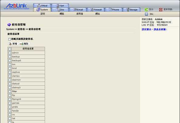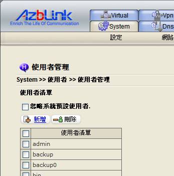 此時,您可能會很困惑,系統才剛安裝完畢,尚未新增任何使用者,怎麼會在所有使用者的頁面就看到一大串使用者帳號呢? 其實,那是系統預設的使用者,專司管理系統的各項功能。常用的如