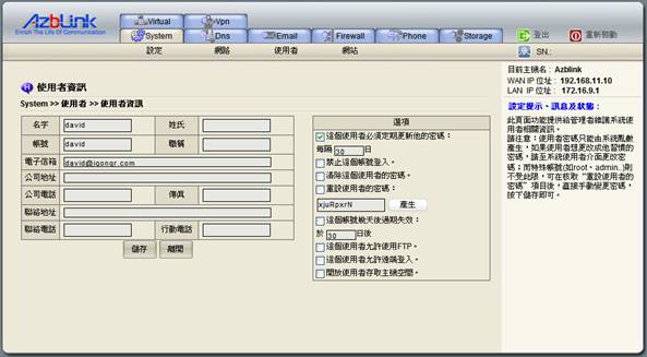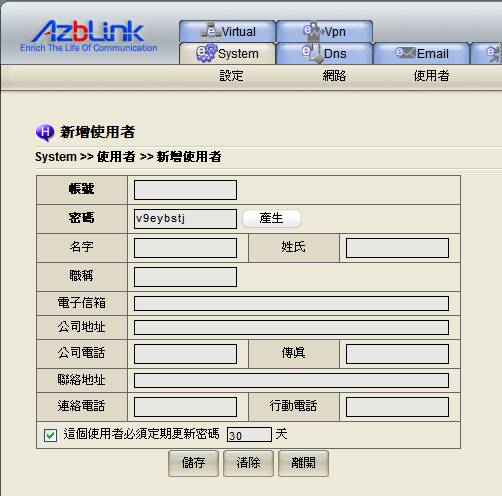 使用者密碼被清除或是遺忘,亦或是該更新密碼卻忘記更新,而導致使用者無法登入的狀況,可在此再產生一組新密碼給予使用者即可。