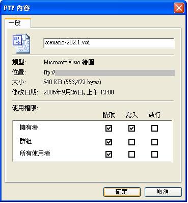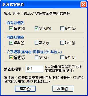 此外,由於FTP管理者ftpmgmt帳號的權限特殊,使用此帳號所傳輸到FTP上的任何檔案之於其他帳號而言,都會有權限方面的問題,如欲使其他帳號也能瀏覽並使用此帳號所上傳的檔案,便必須在FTP上做更改檔案屬性的動作,才能讓其他帳號的使用者順利瀏覽與下載。