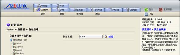 群組是提供系統管理人員將相關屬性(在公司企業裡通常指的是部門)的使用者做個歸納整理。
