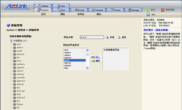 而位於畫面左方的本機群組列,以滑鼠游標按下任一群組名稱,即進入編輯該群組之成員內容;點選群組使用者管理框裡面的使用者帳號,按下加入或離開的按鈕,可讓使用者歸屬或是分離該群組。