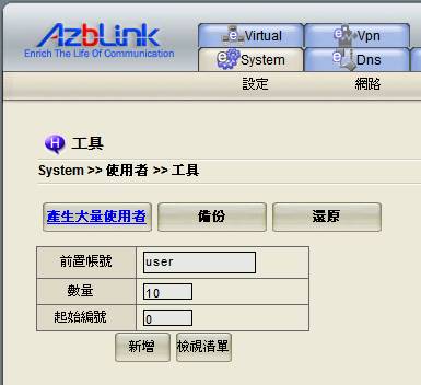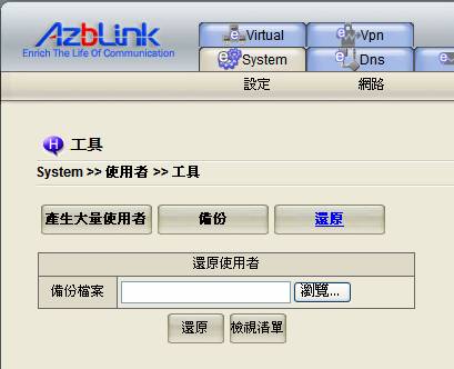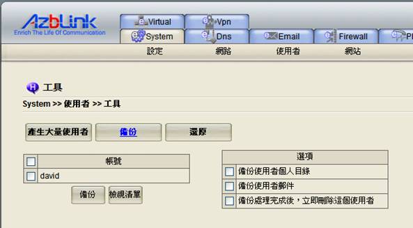 此頁面可用以備份和還原系統內的使用者,以及產生大量的系統使用者帳號。