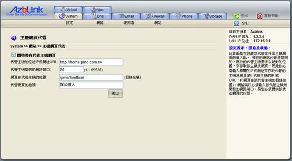 此時,您可以勾選開啟導向代管主機網頁,將虛擬主機代管業者的IP或網址和端口埠號,以及網頁所置放的目錄位置分別填入 代管主機的位址IP或網址URL、 代管主機開啟的網路端口 和 網頁在代管主機的位置 這三個項目中,再將您所想要的網頁抬頭,也就是在網頁左上方會顯示出來的瀏覽器標題,填入 代管網頁的抬頭。如此,即可解決網頁無法瀏覽的問題了。
