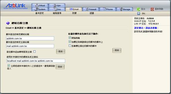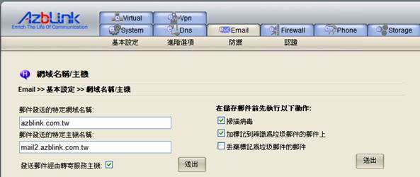 接著我們將介紹一個重要的郵件設定,那就是郵件的保護。 在Azblink系統軟體的郵件伺服器中,我們提供了基本郵件病毒掃描及垃圾郵件的辨識及處理, 您可以在設定頁面中看到以下的核取方塊: