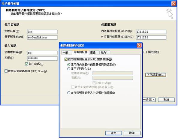 假設您的電子郵件伺服器稱為 'mail.azblink.com.tw',如果您希望用UserId@azblink.com.tw的方式發送郵件,應填入以下資料: