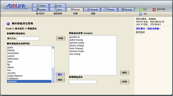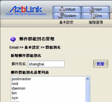 在當您發送一封電子郵件至該別名shanghai@yourdomain.com時,列表中的每位成員都將收到這封郵件。但事實上系統中是沒有此 'shanghai' 使用者的。在此狀況下,您不必專門在伺服器中創建一個名為 'shanghai' 的帳戶。創建一個郵件別名便能達成目的。