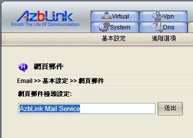 本軟體中提供了由網頁介面的方式來存取郵件, 為了讓安裝了Azblink系統軟體的用戶,能設定公司進入郵件網頁的介面, 使用者可填入你想要的網頁抬頭到 網頁郵件檯頭設定 的欄位中。系統預設值為 Azblink Mail Service,若你沒有更改,它將成為您的網頁郵件的檯頭。
