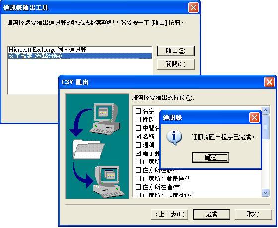 順道一提,由於網頁郵件通訊錄的欄位較精要,在您要匯出Outlook Express聯絡人資訊時,請選擇較重要的欄位進行匯出,以利將它匯入到網頁郵件的通訊錄上。您可先了解 “網頁郵件” 的通訊錄欄位後,再決定您要從您舊版的Outlook Express上匯出的欄位 。