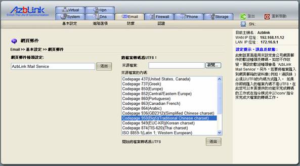 另外,為了要能將Microsoft Outlook Express 連絡人的資訊順利匯入到網頁郵件的 “通訊錄” 中, 在這個頁面裡,Azblink系統軟體中還提供了一個多國碼的轉碼工具。基於MS Outlook Express 的聯絡人資訊在早先比較舊的版本裏是以BIG-5碼去儲存的,而網頁郵件的通訊錄卻須以UTF-8來匯入,因此,當您有需要將您PC上的聯絡人資訊匯入到網頁郵件的通訊錄時,請先把從舊版本的Outlook Express裡,用以逗號間隔的.CSV文字格式匯出的聯絡人資訊,利用本頁的工具進行轉碼後,再匯入到網頁郵件的主機上。匯入的聯絡人資訊為全域可取得的資訊。