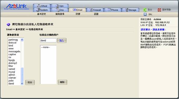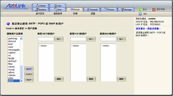 此功能是用來指定禁止使用SMTP、POP3、IMAP功能的用戶名單。