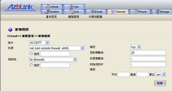 就目的地 (Destination) 此屬性來說,它的用法有很多。在接受 (ACCEPT)、阻止 (DROP) 和拒絕 (REJECT) 的動作中,目的地 (Destination)表示網路傳輸將要到達的區域(net,fw,loc,dmz)在此狀況下,,您可以指定規則如,“接受 (ACCEPT) ”從“net”到“fw”與TCP埠23相關聯的傳輸。