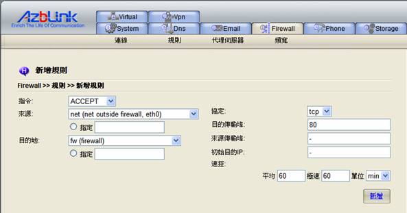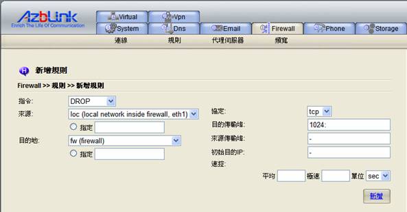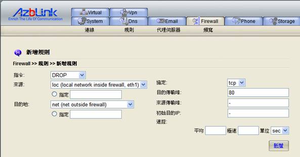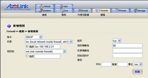 在此狀況下,所有目的地為TCP埠80的外發傳輸(普通http傳輸)都會被封鎖。如您只是想要封鎖某台特定的電腦去存取外部網頁,您可以在來源中指定IP位址。例如: