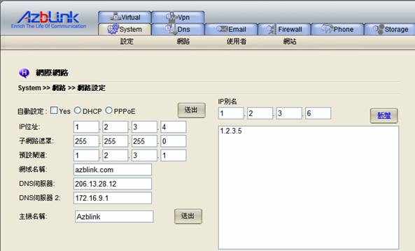 我們用下圖來演示如何使用DNAT。 假設eth0介面擁有3個IP位址:1.2.3.4,1.2.3.5,和1.2.3.6 (額外加入多個公用IP位址可以使用System >> 網路 >> 網際網路 中之IP別名新增的方式)。