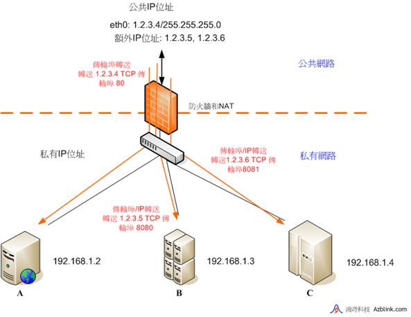 另有3個內部伺服器A、B和C,其IP位址分別為192.168.1.2,192.168.1.3和192.168.1.4。