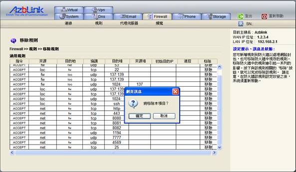 您可為處理網路封包而向邊界控制路由新增規則,也可移除邊界控制路由中現存的規則。移除邊界控制路由中的規則會引起一系列的影響。按下與該規則相關的 移除 按鈕,對跳出的詢問對話框做出確認動作,就可以完成移除的動作。