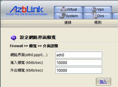 提供網路界面頻寬設定,以限制進出邊界控制路由的頻寬大小。其中,網路界面欄位可填入eth0、eth1、eth2、ppp0等主機所擁有的任一界面名稱;若填入eth0,代表此主機對外與網際網路溝通的eth0界面端的頻寬將受到管制,而管制頻寬的大小則視在進入頻寬與外出頻寬欄位所填入的數值而定。