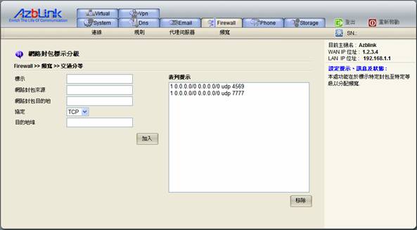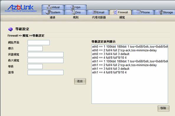 等級設定是用以規範網路進出的優先次序。在介面設限功能頁面設定好對網路介面的頻寬限制之後,系統會在等級設定頁面中自動產生4個等級規範,供系統管理者作為奉行的準則抑或做設定參考的依據,管理者可依實際網路狀況的需要去增加刪減修改這些等級規則。每一網路界面都要記得定義default等級,否則將有可能會造成網路阻塞或其他異常的情況出現。如欲移除所有等級,請務必連同介面設限中的相關設定一併移除。