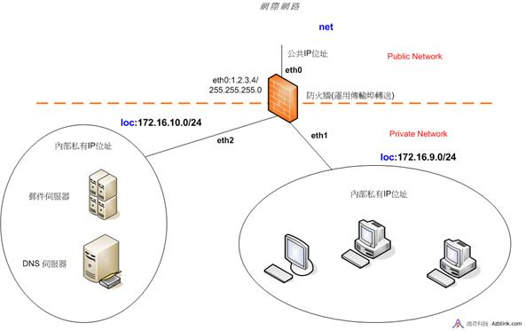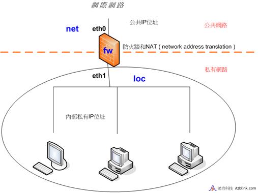 在只有兩個乙太網路界面(稱之為“eth0”和“eth1”)的時候,我們將整個網路分為3個區域,分別以“loc”, “fw”和“net”來標識。“net”代表連接至“eth0”界面的區域,“loc”表示連接至“eth1”的區域,而“fw”則是指邊界控制路由機器本身。